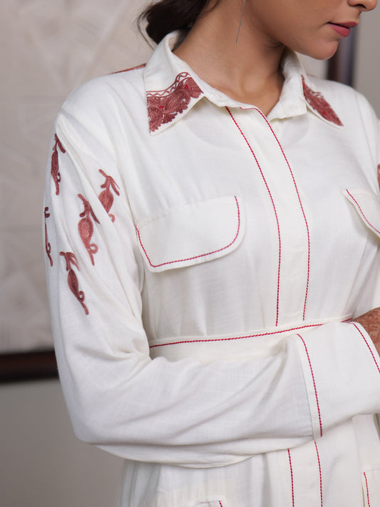Fitoor Kashmiri Aari Embroidered Statement Sleeve Shirt Dress with Belt
