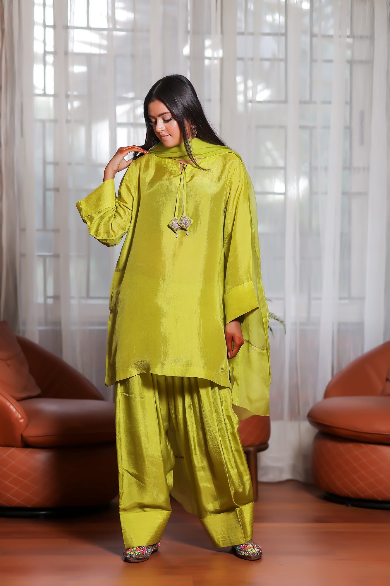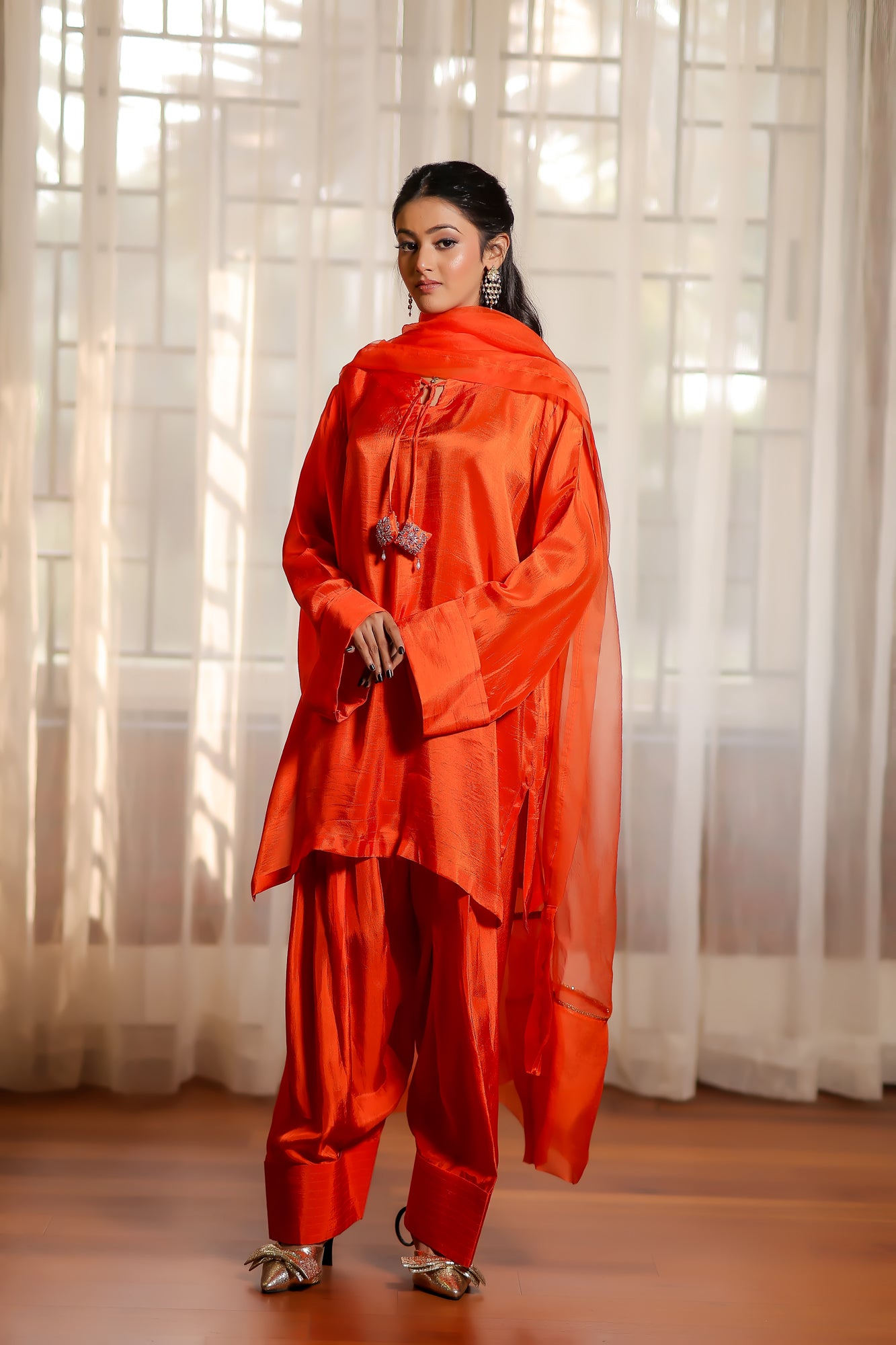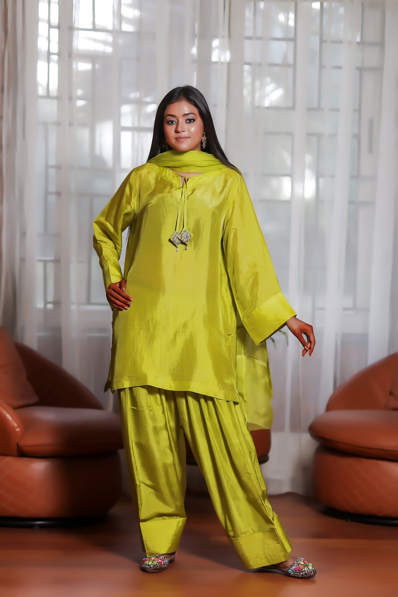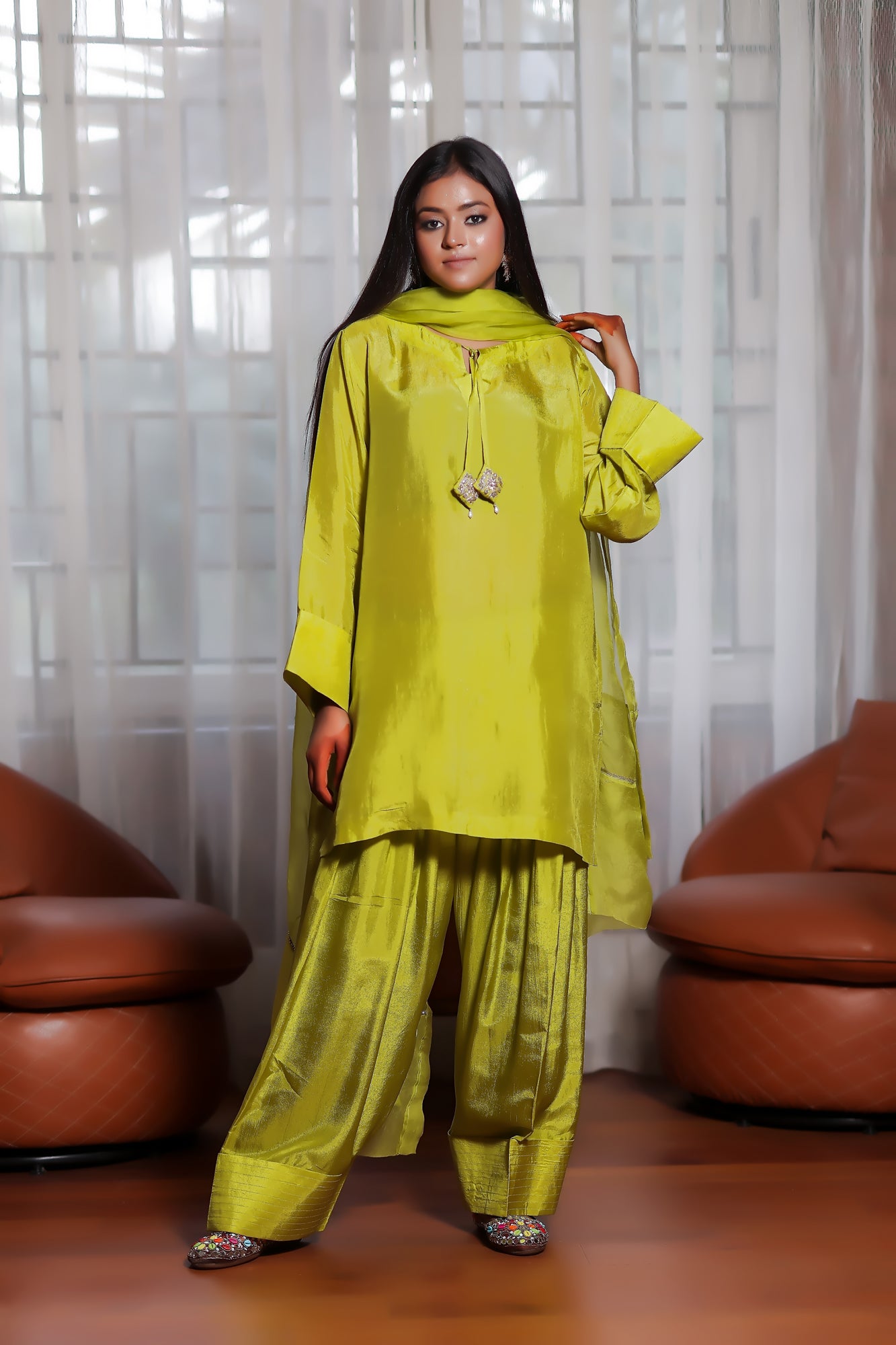 An ode to timeless elegance, the Shabo Farshi Shalwar Set is crafted in luxurious Uppada silk. The short kurta features hand-embroidered tassels with dabka and pearl detailing, paired with a flowing farshi shalwar finished with a comfortable elasticated waist. Style it with a pure organza dupatta edged with embroidered lace (available separately) for a refined festive look that blends tradition with effortless grace.