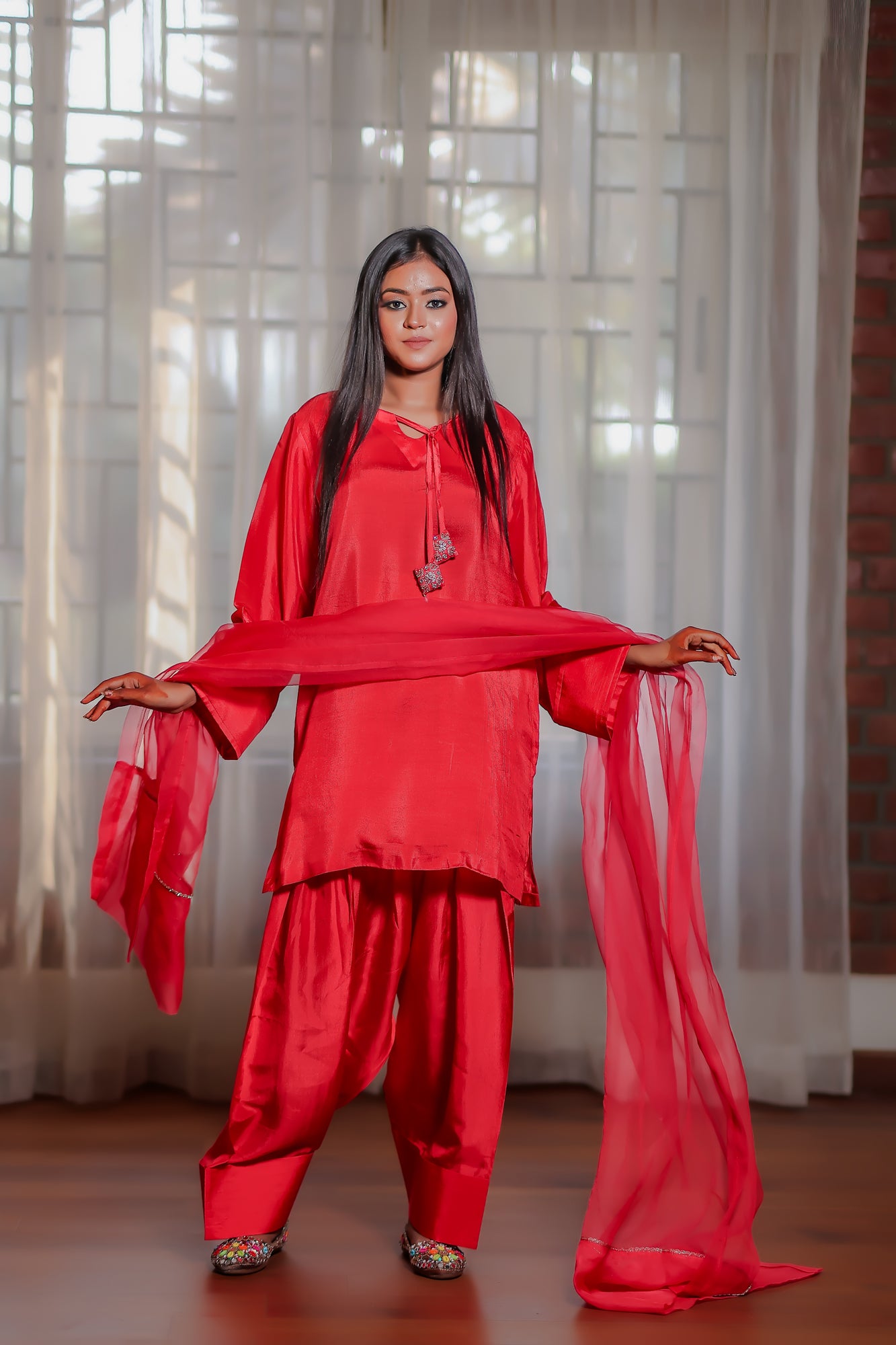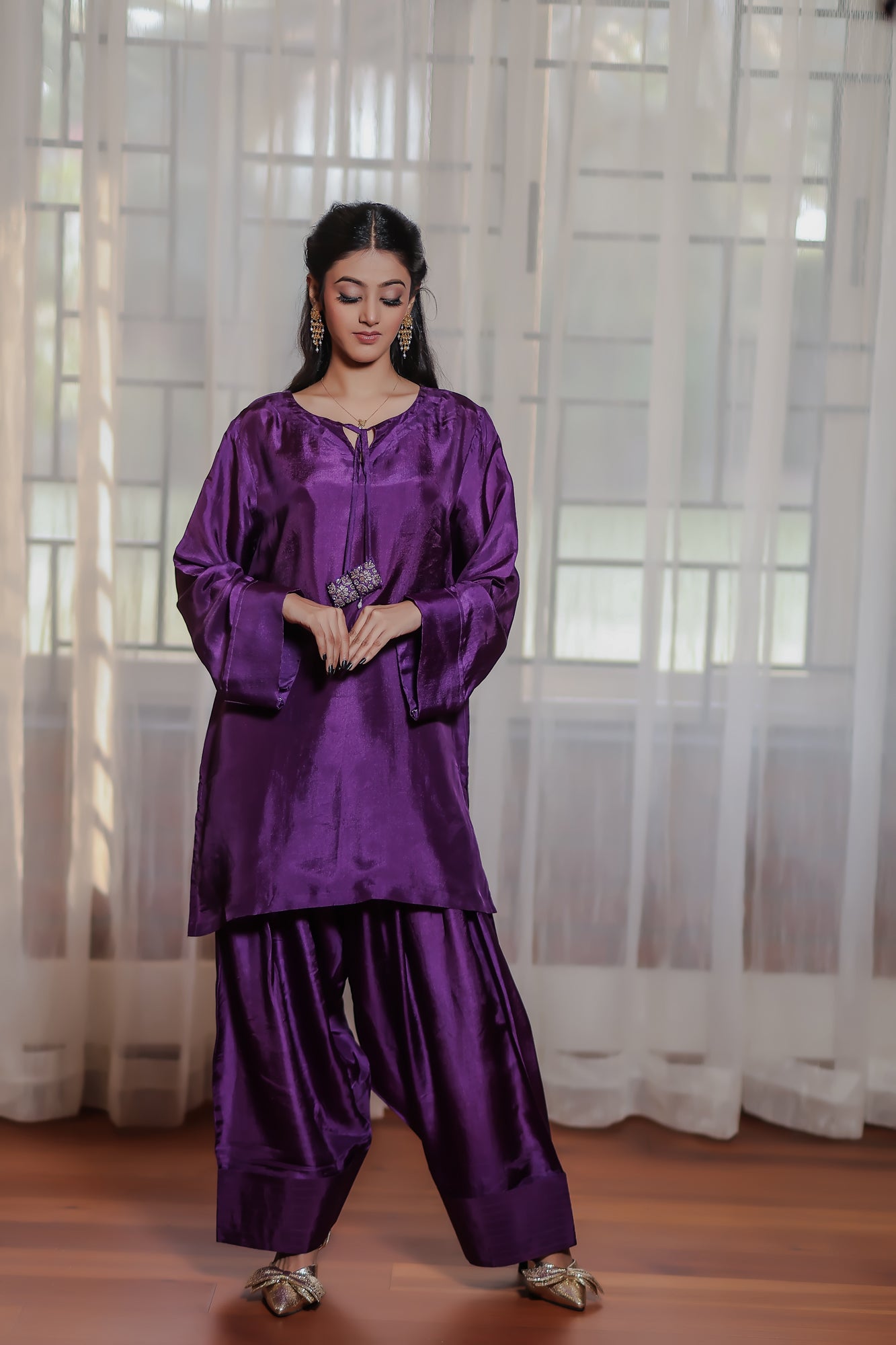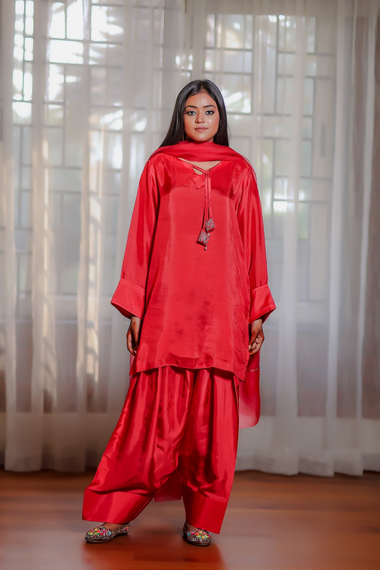 An ode to timeless elegance, the Shabo Farshi Shalwar Set is crafted in luxurious Uppada silk. The short kurta features hand-embroidered tassels with dabka and pearl detailing, paired with a flowing farshi shalwar finished with a comfortable elasticated waist. Style it with a pure organza dupatta edged with embroidered lace (available separately) for a refined festive look that blends tradition with effortless grace.