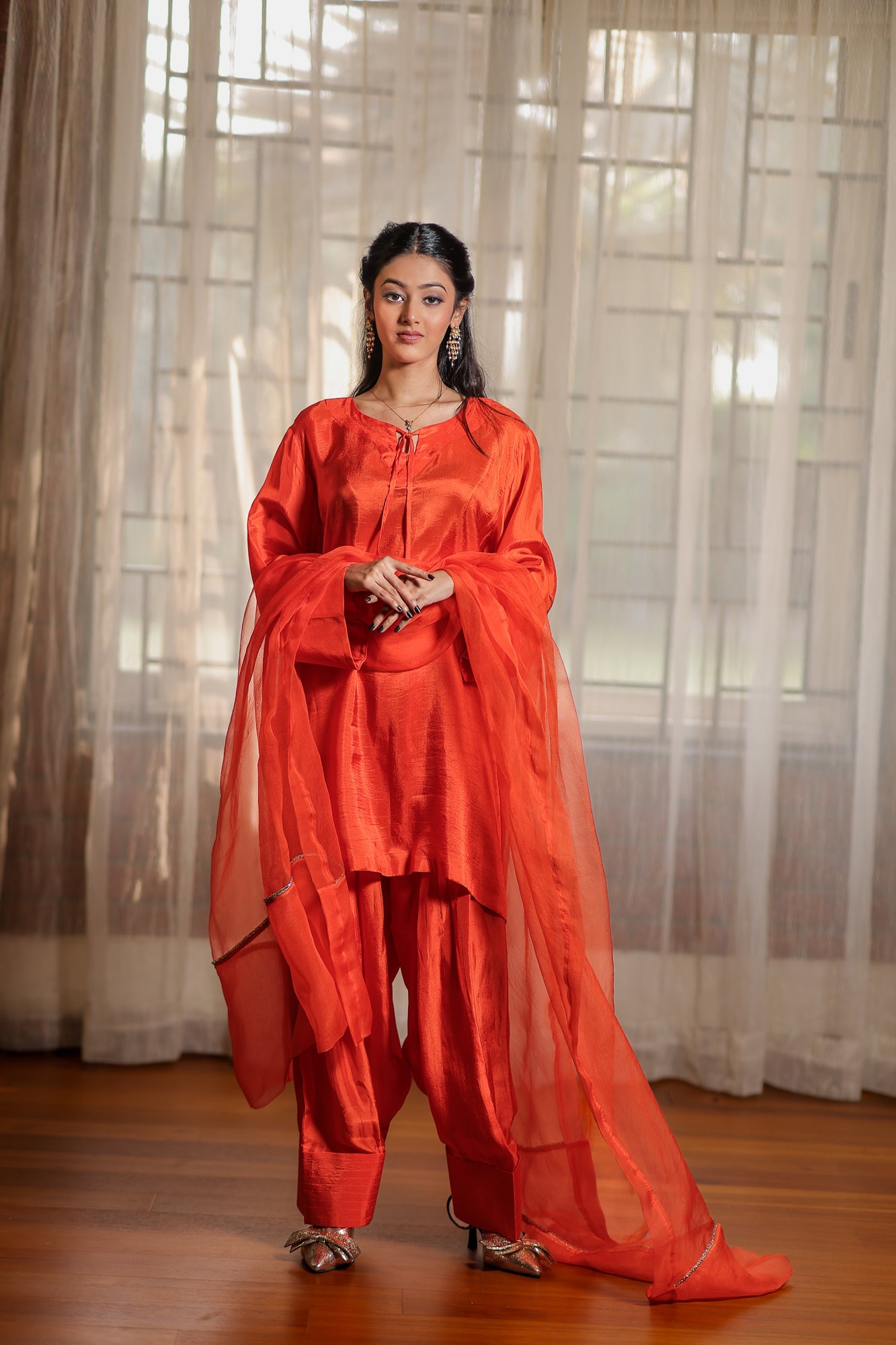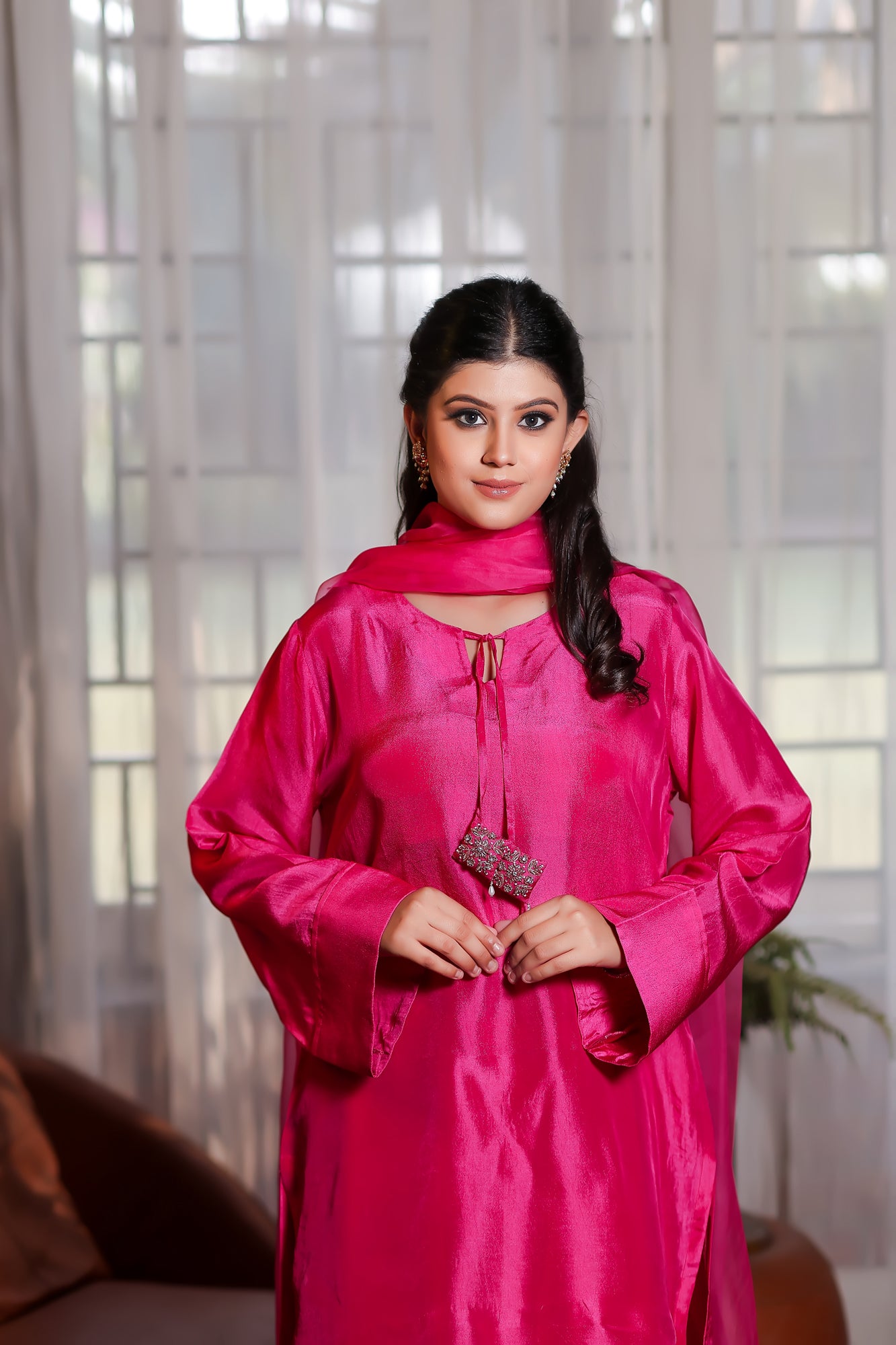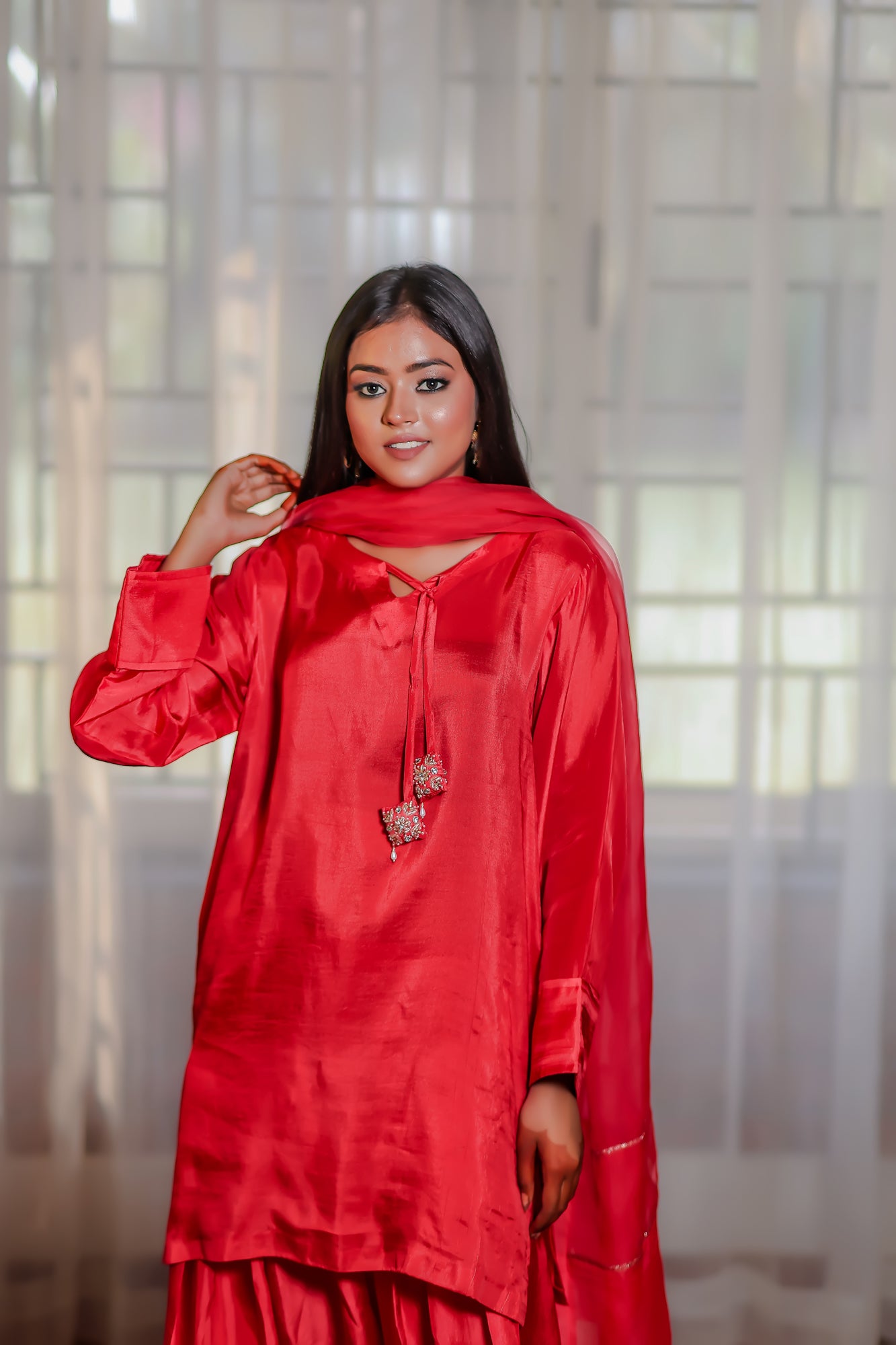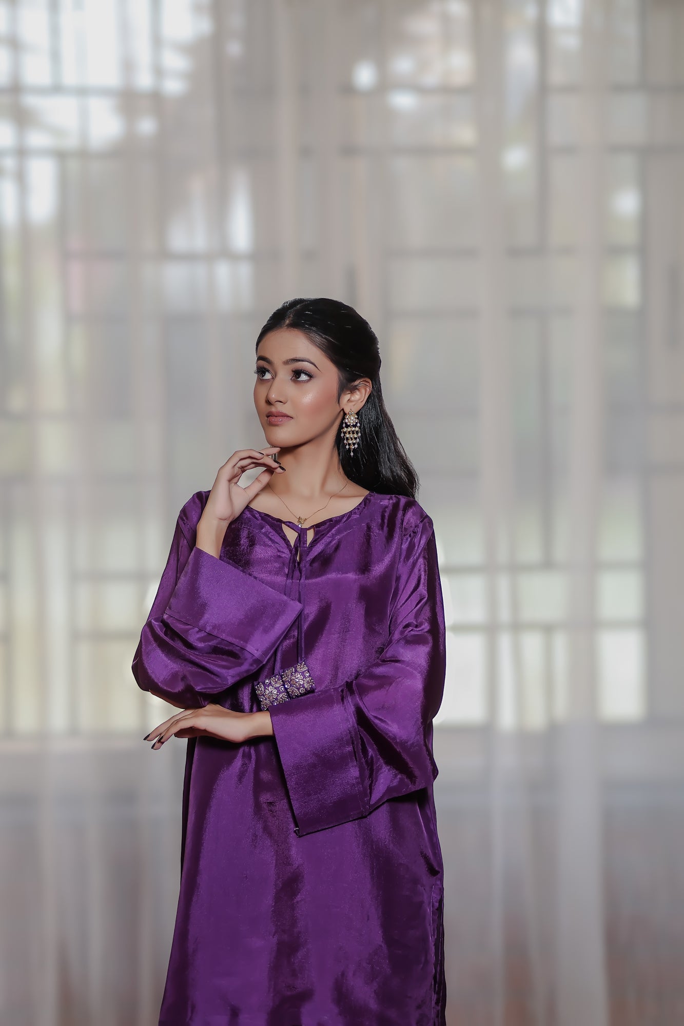 An ode to timeless elegance, the Shabo Farshi Shalwar Set is crafted in luxurious Uppada silk. The short kurta features hand-embroidered tassels with dabka and pearl detailing, paired with a flowing farshi shalwar finished with a comfortable elasticated waist. Style it with a pure organza dupatta edged with embroidered lace (available separately) for a refined festive look that blends tradition with effortless grace.