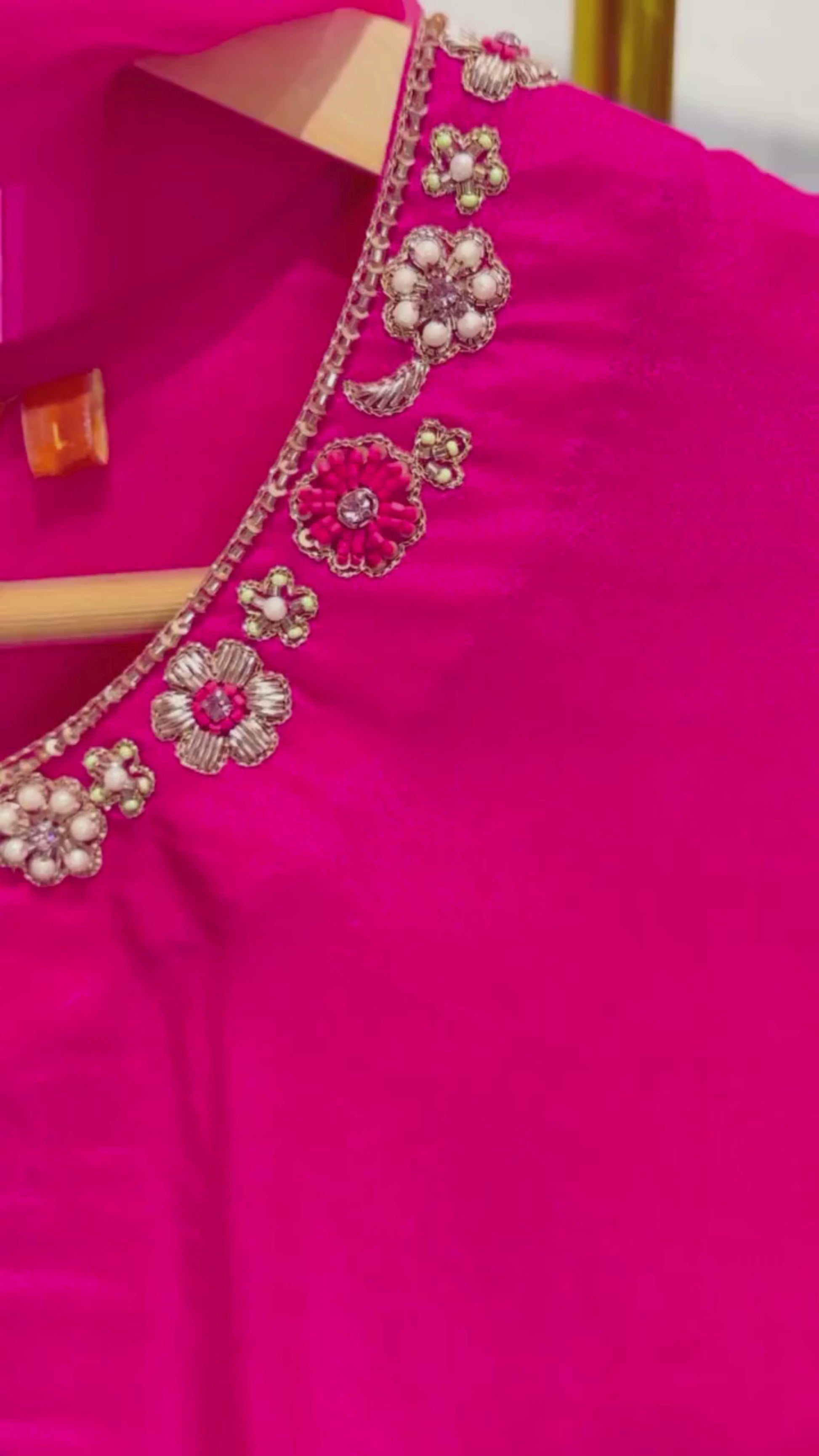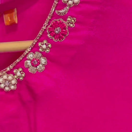 The Gulaabo Farshi Shalwar Set in Uppada silk embodies festive allure with its radiant hue and intricate detailing. The kurta features hand embroidery across the front and sleeves, paired with a solid farshi shalwar designed with an elasticated waist for comfort and ease. Style it with a pure organza dupatta finished with embroidered lace (available separately) for a timeless, graceful ensemble that celebrates tradition with modern poise.